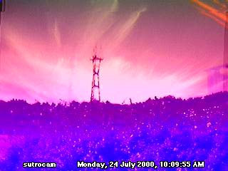Yesterday I began to get annoyed with the poor image quality on the sutrocam, so I stuck my head outside my window and took a look at it. (Yes, it really is outside, stuck on the wall with pushpins.) The lens was covered in some sorta black grime, which explained a lot. So I gave it a good cleaning and the image quality improved. However, I also gave it a good bump, which put it a little off from where it'd been, revealing a giant sutro tower ghost, just to the left of the original, where the image had been burned into the camera over the last few months. Lesson: when a webcam is that cheap, there's probably a reason. + 10:07 AM